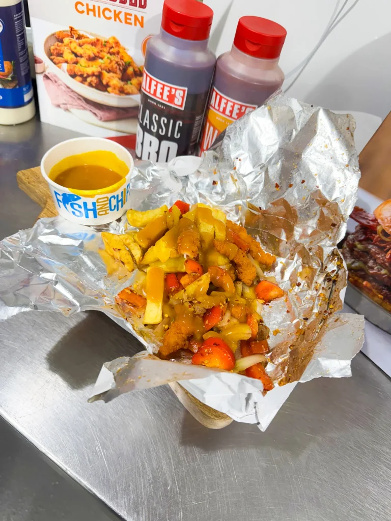 This delicious dish combines a flavorful mix of salt and chilli crispy chicken strips, served alongside a portion of crispy chips. To enhance the experience, we’ve included fresh onions and vibrant peppers for added texture and flavour. All of these tasty ingredients are drizzled with curry sauce and packaged conveniently in one bag for easy enjoyment.